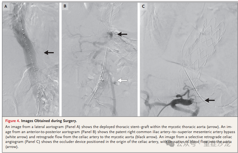 手术期间进行的影像学显示,霉菌性降主动脉和内脏血管得到了满意的血管内排除(图4)。13-16完成成像,缝合切口,并将患者转移到重症监护室。